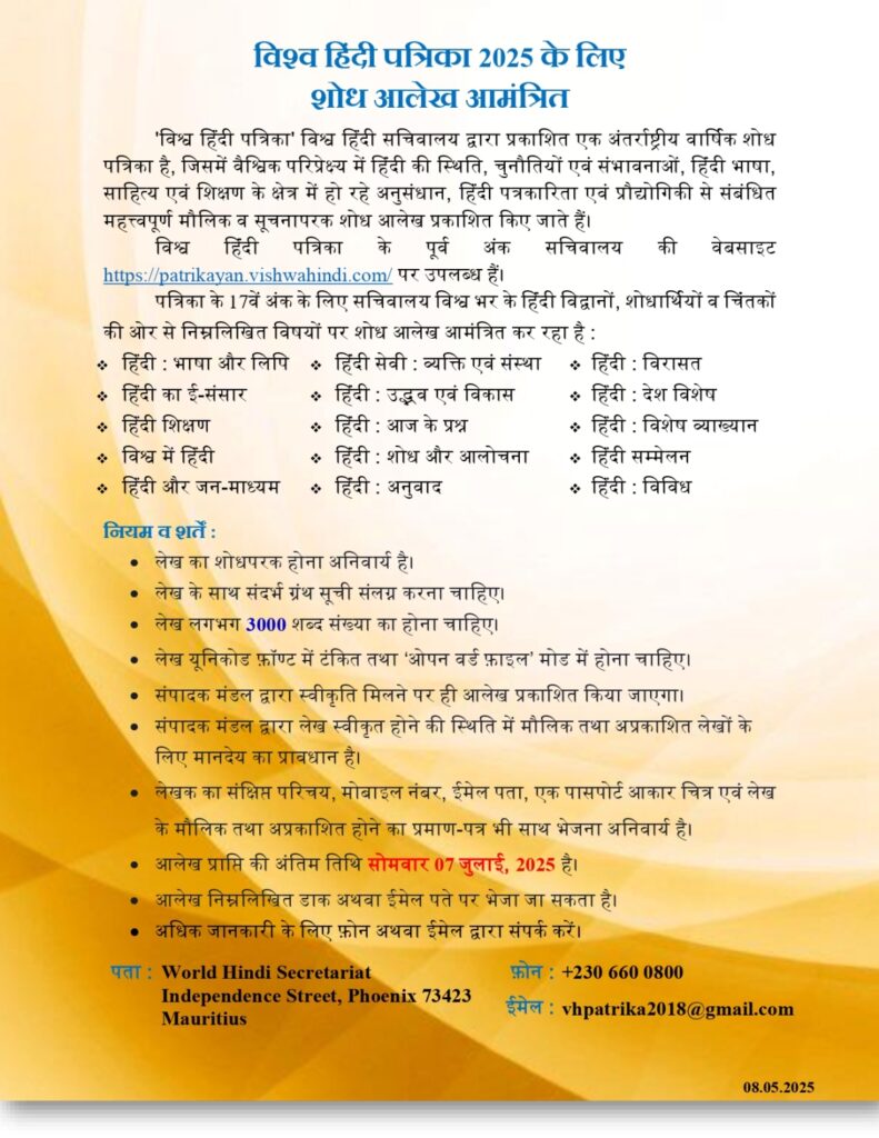 Post navigation विश्व हिंदी साहित्य 2025 के लिए रचनाएँ आमंत्रित – (प्रेस विज्ञप्ति) युवा कहानी लेखन प्रतियोगिता – (सूचना)