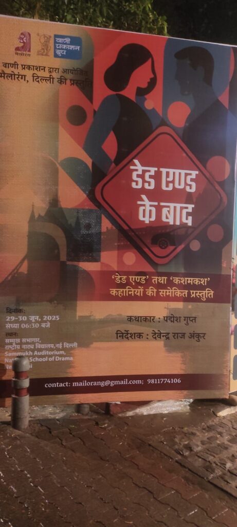 मेलोरंग दिल्ली ( वाणी प्रकाशन) व राष्ट्रीय नाट्य विद्यालय द्वारा ब्रिटेन के प्रतिष्ठित साहित्यकार डॉ पद्मेश गुप्त की कहानियों “डेड एंड“ व “कश्मकश“ दो कहानियों का मंचन राष्ट्रीय नाट्य विद्यालय के निदेशक डॉ देवेंद्र राज अंकुर के निर्देशन में सम्मुख सभागार,राष्ट्रीय नाटक विद्यालय, नई दिल्ली में सफलतापूर्वक किया गया और एक ही मंच पर दो कहानियों के मंचन को नाम दिया गया “डेड एंड के बाद”।