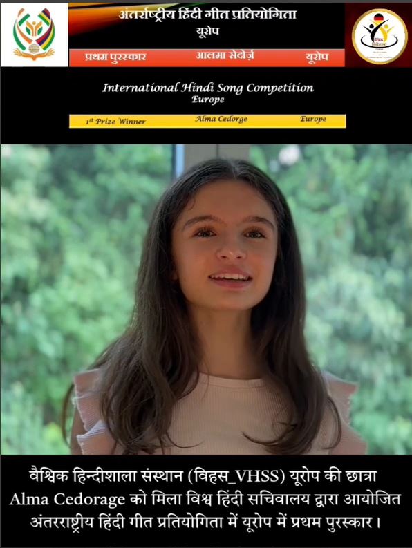 19 जून, 2025 को संगीत दिवस 2025 के उपलक्ष्य में विश्व हिंदी सचिवालय द्वारा आयोजित ‘अंतरराष्ट्रीय संगोष्ठी : हिंदी गीत एवं गज़ल’ कार्यक्रम में वैश्विक हिन्दीशाला संस्थान (विहस_VHSS), यूरोप की छात्रा Alma Cedorage को प्रथम पुरस्कार मिला। अल्मा जर्मन है, इनकी माता रोमानियन है, पिता फ्रांसीसी है। विगत 1 वर्ष से आल्मा हिंदी सीख रही हैं। विभिन्न भाषाओं में रुचि रखने वाली अल्मा भारतीय संस्कृति एवं भाषा के प्रति अत्यधिक लगाव रखती हैं। इन्हें भारतीय परिधानों एवं रंग-बिरंगी चूड़ियों का बहुत शौक है।