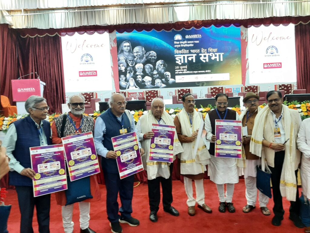 शिक्षा संस्कृति उत्थान न्यास, नई दिल्ली एवं अमृता विश्वविद्यापीठ, कोचीन के संयुक्त तत्वाधान में ‘विकसित भारत हेतु शिक्षा’ विषय पर ज्ञान सभा का राष्ट्रीय आयोजन कोचीन में 28 जुलाई 2025 को सम्पन्न हुआ। इस सभा के मुख्य आयोजक न्यास के सचिव श्री अतुल कोठारी, देश के पूर्व शिक्षा मंत्री श्री रमेश पोखरियाल ‘निशंक’ सहित देश के अनेक गणमान्य शिक्षाविद, कुलाधिपति, कुलगुरु, वरिष्ठ प्रोफेसर, निजी शिक्षण संस्थानों के निदेशक, राज्यों के शिक्षा मंत्री तथा सांसद भी शामिल हुए। सभा में आमंत्रित रबींद्रनाथ टैगोर विश्वविद्यालय के कुलाधिपति और विश्वरंग के निदेशक श्री संतोष चौबे एवं अंतरराष्ट्रीय हिंदी केंद्र के निदेशक डॉ. जवाहर कर्णावट ने राष्ट्रीय शिक्षा नीति 2020 के अंतर्गत विश्वविद्यालय में किए जा रहे विशिष्ट कार्यों तथा अंतरराष्ट्रीय हिंदी ओलंपियाड की जानकारी प्रदान की। सभा के समापन अवसर पर अंतरराष्ट्रीय हिंदी ओलंपियाड पोस्टर का लोकार्पण देश के पूर्व शिक्षा मंत्री श्री रमेश पोखरियाल ‘निशंक’, सांसद एवं उत्तर प्रदेश के पूर्व उप मुख्यमंत्री डॉ. दिनेश शर्मा ,इंदिरा गांधी राष्ट्रीय कला केंद्र के सचिव श्री सच्चिदानंद जोशी, श्री संतोष चौबे, डॉ. जवाहर कर्नावट आदि ने किया।