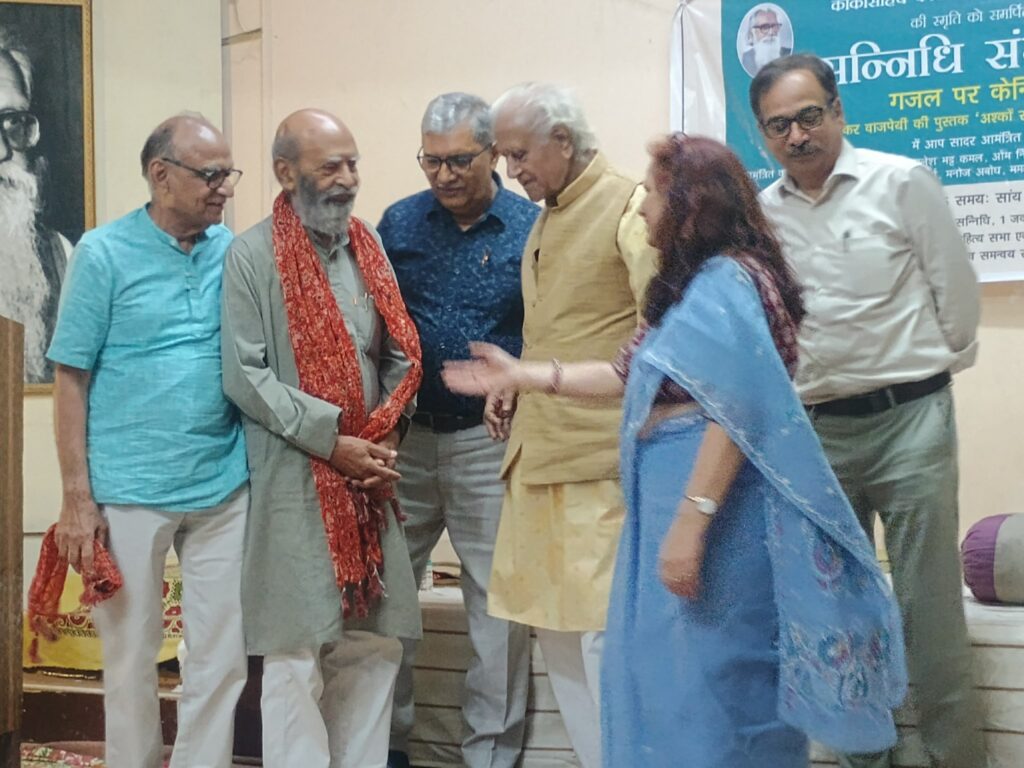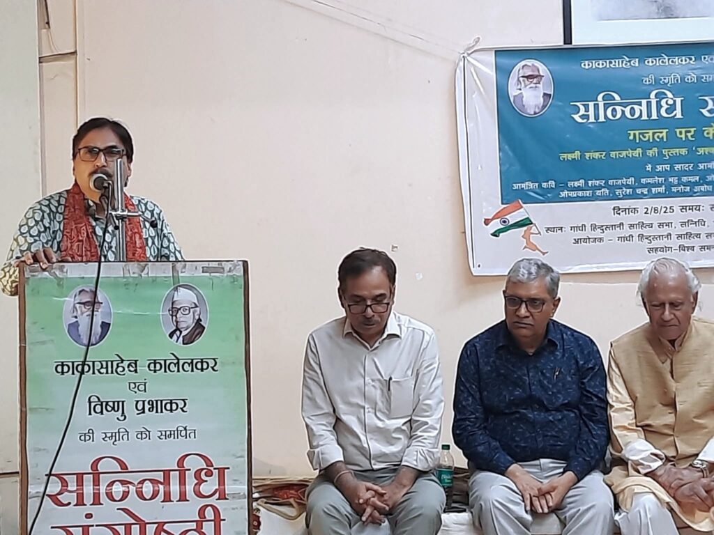“गांधी हिंदुस्तानी साहित्य सभा, दिल्ली” में आयोजित “सन्निधि संगोष्ठी” इस बार ग़ज़ल पर केंद्रित रही, जिसमें प्रसिद्ध साहित्यकार लक्ष्मी शंकर बाजपेई जी की पुस्तक “अश्कों से लफ़्ज़ों तक” पर चर्चा में विधा-विशेषज्ञों श्री विजय स्वर्णकार, श्री कमलेश भट्ट कमल, डॉ ओम निश्चल ने अपने विचार साझा किए।