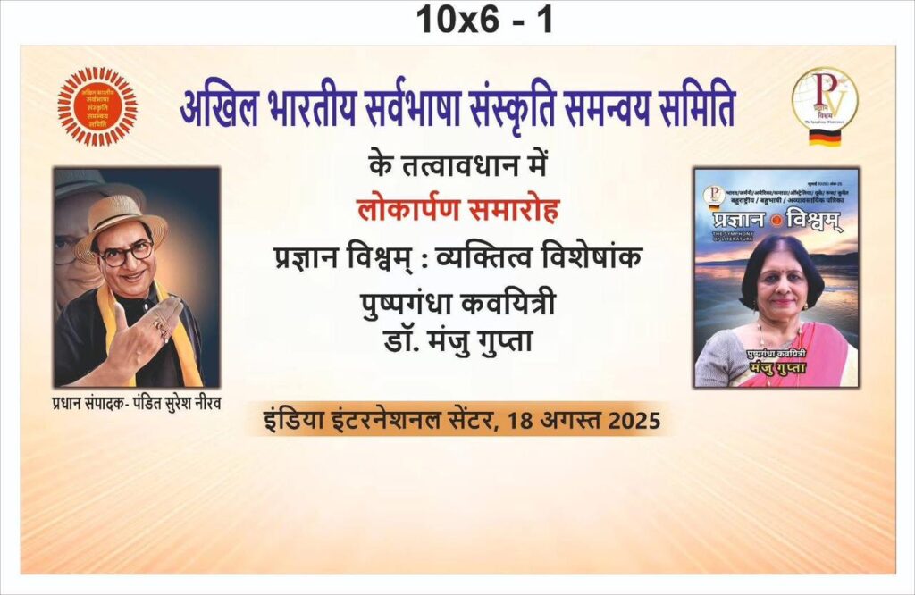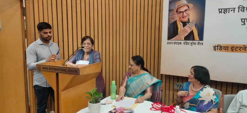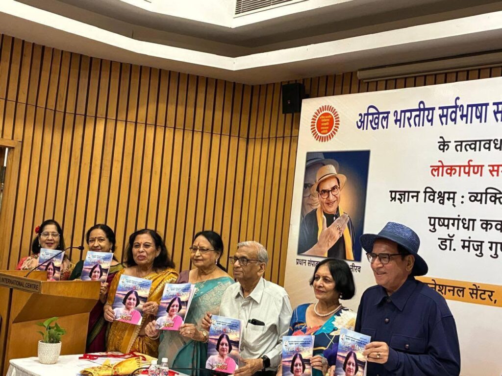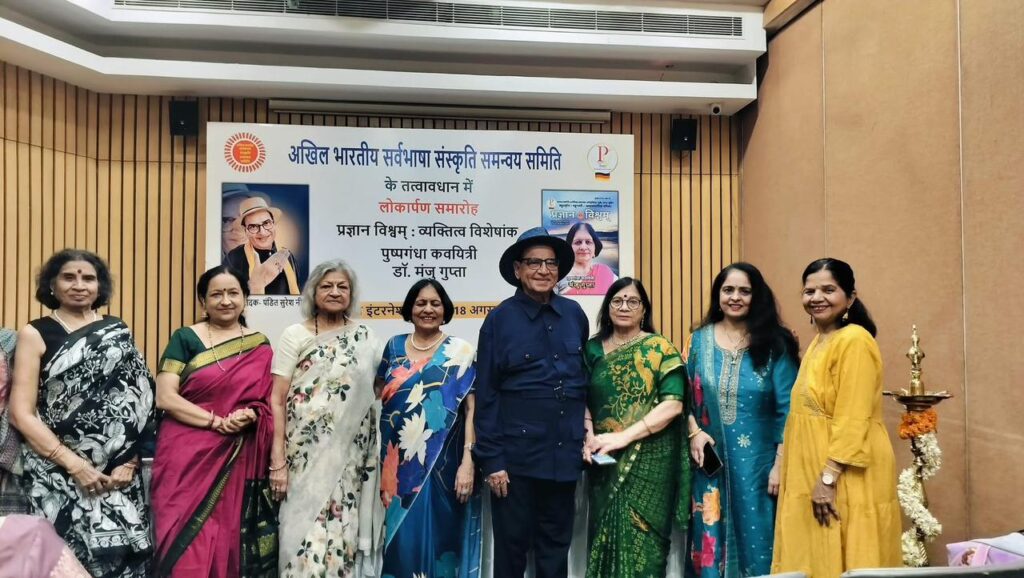अखिल भारतीय सर्वभाषा संस्कृति समन्वय समिति द्वारा प्रकाशित पत्रिका “प्रज्ञान विश्वम् “का सुप्रसिद्ध कवयित्री व पूर्व प्राचार्या “डॉ मंजु गुप्ता “के लेखन ,साहित्य व जीवन पर केंद्रित विशेषांक का लोकार्पण इंडिया इंटरनेशल सेंटर में आयोजित किया गया। “प्रज्ञान विश्वम् “के प्रधान संपादक पंडित सुरेश नीरव जी ने कार्यक्रम की अध्यक्षता की। कार्यक्रम की मुख्य अतिथि वरिष्ठ साहित्यकार पद्मश्री डॉ शीला झुनझुनवाला जी थीं। विशिष्ट अतिथि वरिष्ठ भाषाविद डॉ विमलेश कांति वर्मा जी व वरिष्ठ साहित्यकार डॉ कुसुम अंसल रहीं। विशिष्ट वक्ता डॉ अनीता वर्मा व डॉ मधुरिमा कोहली ने अपनी विशेष उपस्थिति दर्ज की। गायिका डॉ कुमकुम झा ने मधुर स्वर में सरस्वती वंदना से कार्यक्रम आरंभ किया। पूर्व प्रोफेसर व गायिका डॉ राधिका सिंह ने डॉ मंजु गुप्ता की कविता को स्वरबद्ध करके अपने मधुर स्वर में सुनाया। कार्यक्रम का सशक्त संचालन हास्य व्यंग्य कवयित्री निशा भार्गव ने किया