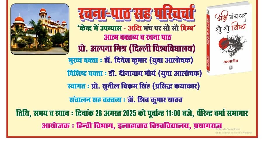 इलाहाबाद विश्वविद्यालय के हिंदी विभाग की ओर से दिनांक 28 अगस्त 2025, गुरुवार को ‘रचना-पाठ सह परिचर्चा’ का आयोजन किया गया।
