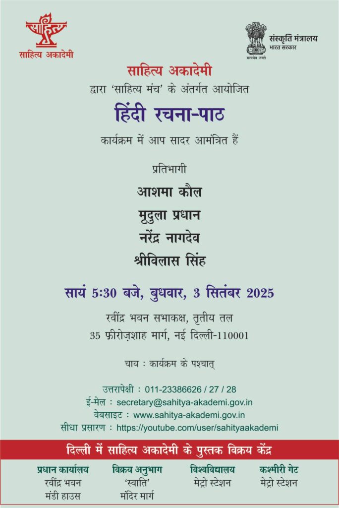 साहित्य अकादेमी द्वारा कार्यक्रम “साहित्य मंच : हिंदी लेखकों का रचना-पाठ”, 3 सितंबर 2025, सायं 5.30 बजे तृतीय तल सभाकक्ष, रवींद्र भवन, नई दिल्ली में किया जाएगा।