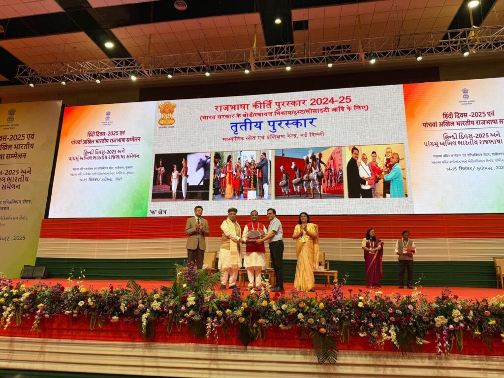 हिंदी दिवस समारोह 2025 एवं पंचम अखिल भारतीय राजभाषा सम्मेलन के अवसर पर आज महात्मा मंदिर कन्वेंशन एवं एग्ज़िबिशन सेंटर, गांधीनगर, गुजरात में आयोजित भव्य समारोह में सांस्कृतिक स्रोत एवं प्रशिक्षण केंद्र (सीसीआरटी), नई दिल्ली को राजभाषा कीर्ति पुरस्कार (तृतीय पुरस्कार) 2024-25 प्रदान किया गया। समारोह में मुख्य अतिथि केंद्रीय गृह एवं सहकारिता मंत्री माननीय श्री अमित शाह जी के साथ केंद्रीय विधि एवं न्याय राज्यमंत्री माननीय श्री अर्जुन राम मेघवाल जी के करकमलों से सीसीआरटी के माननीय अध्यक्ष महोदय डॉ. विनोद नारायण इंदुरकरजी ने शीर्ष के रूप में संस्थान के अधिकारियों के साथ मंच पर उपस्थित होकर यह पुरस्कार ग्रहण किया। इस समारोह में श्री दिनेश शर्मा जी राज्यसभा सांसद की भी गरिमामयी उपस्थिति रही।