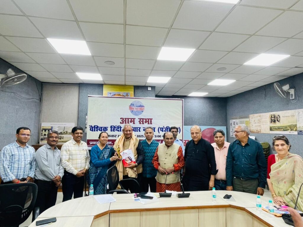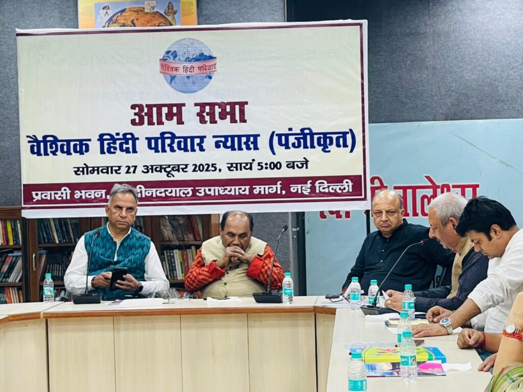दिनांक 27/10/2025 वैश्विक हिंदी परिवार की वार्षिक आम सभा सत्र 2024-25 प्रवासी भवन में श्री अनिल जोशी की अध्यक्षता में संपन्न हुई। जिसमें बैठक पूर्व उपस्थित सदस्यों/ साहित्यकारों के मध्य एक काव्य गोष्ठी का आयोजन किया गया। तदुपरान्त श्री राजेश चेतन जी (सचिव) ने अपने उद्बोधन के साथ वार्षिक रिपोर्ट प्रस्तुत की, जिसमें वर्ष भर में न्यास द्वारा किए गए कार्यक्रमों का विवरण एवं उनके द्वारा वैश्विक हिंदी परिवार की विदेशों में बढ़ती लोकप्रियता के साथ उसके वैश्विक प्रसार पर चर्चा की। तत्पश्चात श्री विनयशील चतुर्वेदी (कोषाध्यक्ष) ने विगत सत्र में प्राप्त सहयोग राशि और उसके व्यय एवं शेष राशि से संबंधित ब्यौरा प्रस्तुत किया, जिसका सभी सदस्यों ने ध्वनि मत से समर्थन किया।