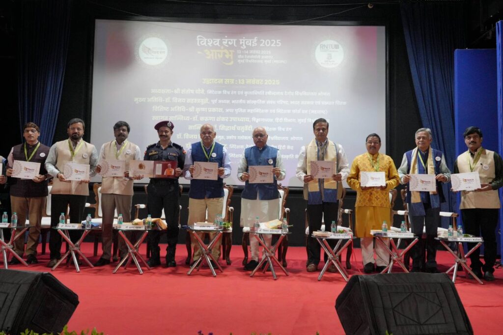 विश्व रंग 2025 आरंभ मुंबई का भव्य शुभारंभ विश्व रंग फाउंडेशन, रबीन्द्रनाथ टैगोर विश्वविद्यालय, भोपाल एवं हिंदी विभाग, मुंबई विश्वविद्यालय, मुंबई के संयुक्त तत्वावधान में विश्वविद्यालय परिसर में स्थित ग्रीन टेक्नोलॉजी सभागार में पूर्ण भव्यता से आयोजित किया गया। विश्व रंग आरंभ मुंबई का शुभारंभ *मंगलाचरण* से करते हुए सर्वप्रथम डॉ. सुरुचि मोहता, सुप्रसिद्ध शास्त्रीय गायिका द्वारा मुंबई के ग्राम देवता सिद्धि विनायक की स्तुति में बहुत ही सुंदर भजन प्रस्तुत किया। उन्होंने तुलसीदास रचित पद ‘सदा सदा मैं शरण तिहारो, तुम हो गरीबनवाज, रघुवर तुमको मेरी लाज’ की मनमोहक प्रस्तुति के साथ ही महात्मा गांधी के प्रिय भजन ‘वैष्णव जन तो तेने कहिये, पीर पराई जाणे रे, की मधुर प्रस्तुति जगत कल्याण और वैश्विक सद्भावना को केंद्र में रखते हुए दी। इस अवसर पर श्री संतोष मिश्रा और श्री विनोद फड़के ने संयुक्त रूप से संगीतज्ञ की महत्वपूर्ण भूमिका निभाई।