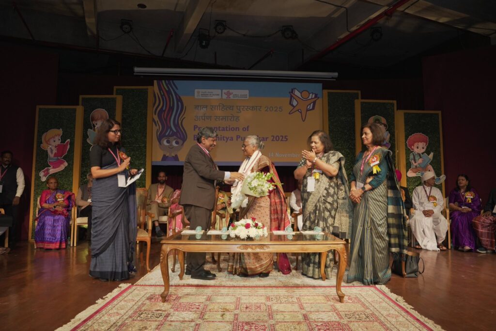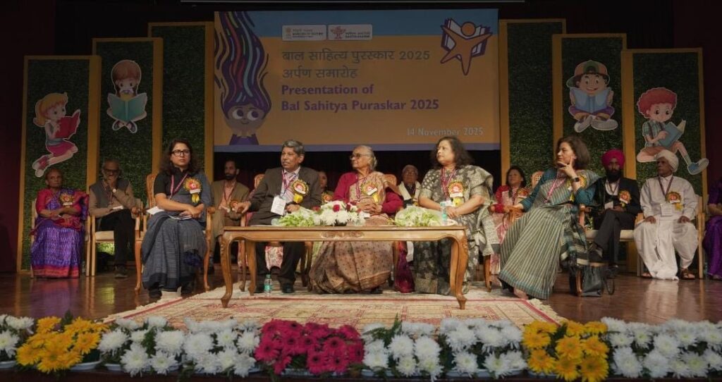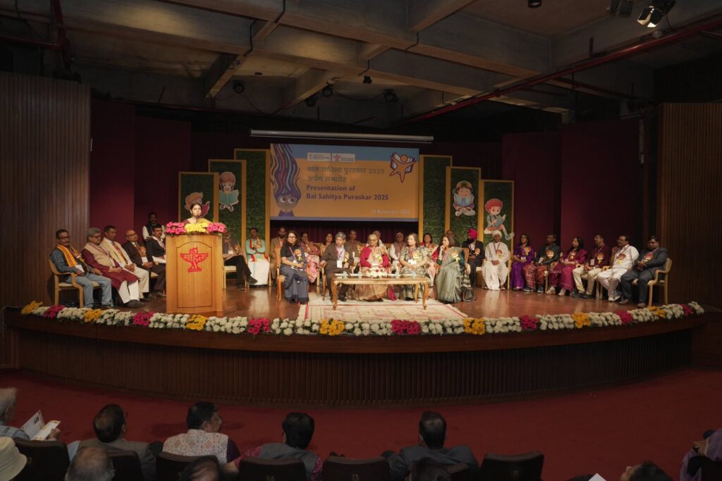 नई दिल्ली। 14 नवंबर 2025; साहित्य अकादेमी द्वारा प्रतिवर्ष दिए जाने वाले प्रतिष्ठित बाल साहित्य पुरस्कार 2025, आज त्रिवेणी कला संगम, नई दिल्ली में आयोजित एक भव्य समारोह में प्रदान किए गए। पुरस्कार समारोह की मुख्य अतिथि प्रख्यात गुजराती लेखिका वर्षा दास ने कहा कि बाल साहित्य हमें अनेकता में एकता का अनोखा संदेश देता है। अतः इसका लेखन हमारे समाज के लिए बहुत महत्त्वपूर्ण है और हमें बाल साहित्य बच्चों को निरंतर मिलता रहे, इसके लिए हमेशा प्रयासरत रहना चाहिए। उन्होंने गुजराती के प्रख्यात बाल साहित्यकार गिजु भाई बधेका के लेखन के अनेक उदाहरणों से समझाया कि बच्चे बाल साहित्य पढ़कर जहाँ पढ़ाई में रुचि लेते हैं, वहीं उनका आत्मविश्वास भी बढ़ता है। कहानियों की विविधता उन्हें सारे संसार से जोड़ती है। उन्होंने साहित्य अकादेमी द्वारा बाल साहित्य के विभिन्न भारतीय भाषाओं में अनुवाद को बहुत जरूरी मानते हुए इसको निरंतर बनाए रखने का सुझाव दिया। अपने अध्यक्षीय वक्तव्य में साहित्य अकादेमी के अध्यक्ष माधव कौशिक ने कहा कि बाल साहित्यकार ही अब दादा-दादी और शिक्षक तथा माता-पिता की भूमिका में है। अच्छा बाल साहित्य अगर बच्चों को बचपन से ही पढ़ने के लिए मिले तो वह विभिन्न तरह की आतंकी गतिविधियों से भी दूर रहेंगे। इंसान को इंसान बनाने वाला यह सच्चा साहित्य है और इसके निरंतर सृजन से ही बच्चों की मुस्कान वापस आ सकती है।