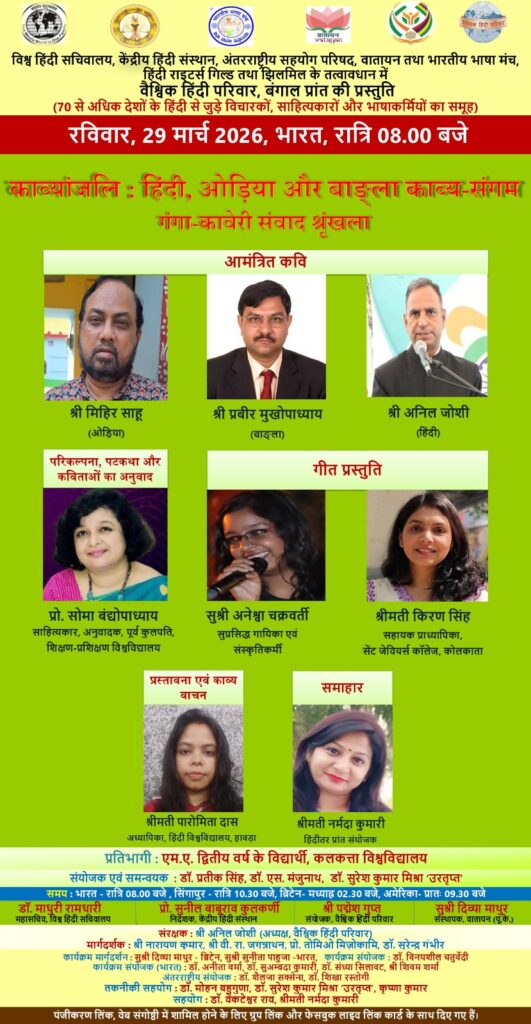 दिनांक 29 मार्च 2026 को विश्व हिंदी सचिवालय, केंद्रीय हिंदी संस्थान, अंतरराष्ट्रीय सहयोग परिषद, वातायन, भारतीय भाषा मंच, हिंदी राइटर्स गिल्ड तथा झिलमिल के तत्वाधान में वैश्विक हिंदी परिवार, बंगाल प्रांत की प्रस्तुति ‘गंगा-कावेरी संवाद श्रृंखला’ हिंदीतर प्रांत कार्यक्रम के अंतर्गत एक अत्यंत भावपूर्ण एवं सांस्कृतिक गरिमा से युक्त ऑनलाइन कार्यक्रम ‘काव्यांजलि: हिंदी, ओड़िआ और बांग्ला काव्य संगम’ का सफल आयोजन किया गया। यह आयोजन हिंदी भाषा और भारतीय भाषाओं के अंतर्संबंधों को सुदृढ़ करने की दिशा में एक महत्त्वपूर्ण पहल सिद्ध हुआ।