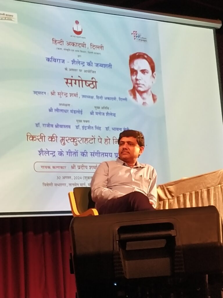 दिनांक 30.08.2024 को नई दिल्ली के आईटीओ स्थित त्रिवेणी कला संगम के सभागार में दिल्ली सरकार के कला, संस्कृति एवं भाषा विभाग के अंतर्गत संचालित हिन्दी अकादमी, दिल्ली के तत्वावधान में कविराज शैलेन्द्र की जन्मशती के अवसर पर एक संगोष्ठी का भव्य आयोजन किया गया।