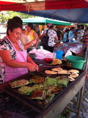 अगले दिन नाश्ते के बाद, गर्मियों के हल्के कपड़े पहने हम दोनों सफ़र के लिये निकल पड़े। रास्ते में रुकते रुकाते और caess के छोटे-छोटे rural distribution centre में विज़िट करते हुये हम आगे बढ़े चले जा रहे थे। कोई एक बजे जब भूख लगी तो टॉम ने एक फेरी वाली (street vendor), जो मक्की से बने तॉर्तिया और red fried beans (राजमाँ) बेच रही थी, की दुकान के आगे गाड़ी रोकी। हम वहीं पर पड़ी कुछ कुर्सियों पर बैठ कर खाने में मस्त हो गये। इसी बीच मैंने देखा कि वहीं पर तॉर्तियों के साथ साथ ब्रैड पकौड़े जैसा पीले रँग का प्लेट में कुछ रखा हुआ है। कौतहूल जागा कि यह अवश्य शाकाहारी डिश होगी। मेरे पूछने पर टॉम ने मुस्कराकर कहा कि क्यों नहीं इसे उठाकर ख़ुद देख लेते कि क्या है। उसके कहने पर जैसे ही मैंने उस डिश को अपने फ़ॉर्क से उठाना चाहा, वो फिसल कर वापस प्लेट में गिर पड़ी। दोबारा उठाने की कोशिश की तो फिर वही फिसलन। कौतहूल जागा कि यह आख़िर क्या बला है। पूछने पर टॉम ने हँसते हुये बताया कि यह fried oxtongue है और यह यहाँ की delicacy है। अब मैं ठहरा शाकाहरी। क्या कहूँ। बस बात को आगे न बढ़ाकर वहीं समाप्त कर दिया।
