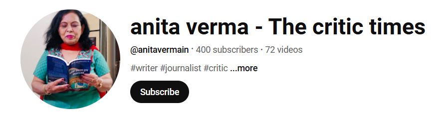 साहित्यकार, समीक्षक एवं पत्रकार अनीता वर्मा का ये यूट्यूब चैनल साहित्य की दृष्टि से समृद्ध है। इस चैनल पर देश-विदेश के प्रतिष्ठित साहित्यकारों की पुस्तकों एवं रचनाओं पर चर्चा की जाती है। पुस्तकों की समीक्षा से जुड़ी अनीता वर्मा लम्बे समय तक कई समाचार पत्रों व चैनलों पर चर्चा करती रहीं हैं।