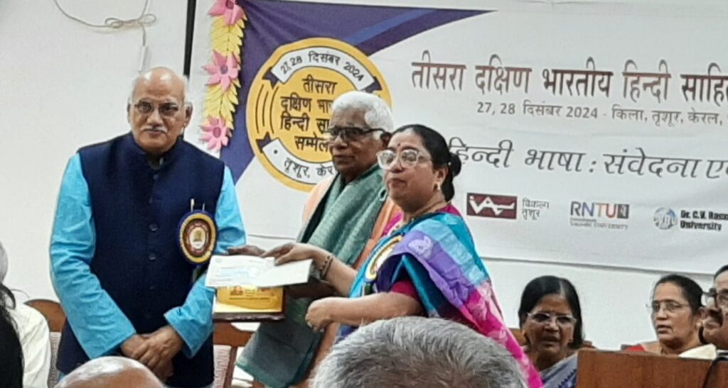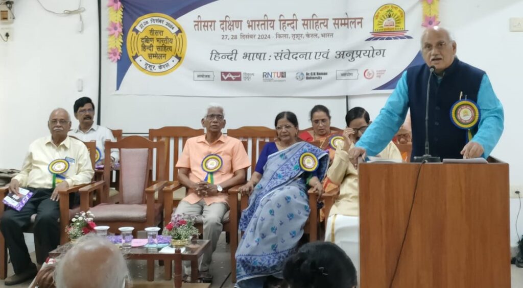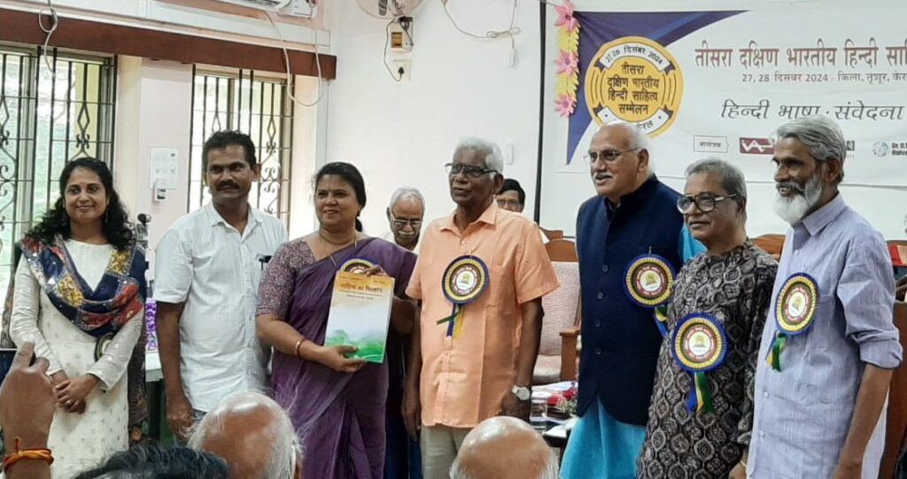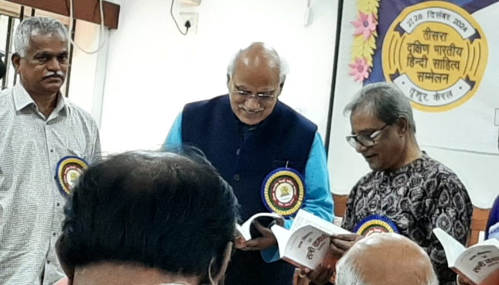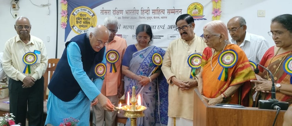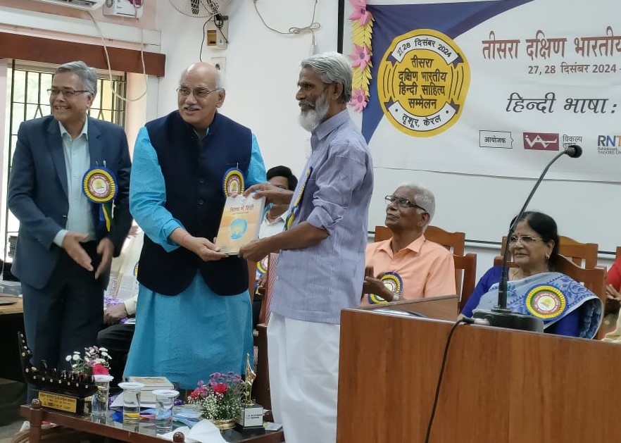 दिनांक 27.12.2024 को तृशूर (केरल) में आयोजित दो दिवसीय दक्षिण भारतीय हिंदी साहित्य सम्मेलन का शुभारंभ मुंबई की वरिष्ठ कथाकार मधु कांकरिया जी ने किया। इस अवसर पर मुख्य अतिथि रबींद्रनाथ टैगोर विश्वविद्यालय भोपाल के कुलाधिपति श्री संतोष चौबे जी ने बीज वक्तव्य प्रस्तुत किया। उन्होंने कहा कि साहित्य का आकलन मन के चश्मे से करेंगे तो एक नई दृष्टि मिलेगी। हमारी अदृश्यता को भेदने का कार्य कला-साहित्य ही कर सकता है, विज्ञान नहीं। कार्यक्रम की अध्यक्षता मलयालम के विद्वान डॉक्टर के.जी. प्रभाकरन ने की। इस समारोह में प्रमुखत: दक्षिण भारत और देश के अन्य प्रांतों से 150 से अधिक प्रतिनिधियों की भागीदारी रही। समारोह में श्री चौबे ने दक्षिण भारत के हिंदी विद्वानों को भी सम्मानित किया। इस अवसर पर ‘विश्व में हिंदी ‘ पुस्तक कार्यक्रम के संयोजक श्री वी.जी. गोपीनाथन को श्री चौबे एवं अंतरराष्ट्रीय हिंदी केंद्र के निदेशक डॉक्टर जवाहर कर्णावट ने भेंट की। कार्यक्रम में ‘साहित्य का विश्व रंग’ पत्रिका के नवीन अंक का लोकार्पण श्री लीलाधर मंडलोई जी की उपस्थिति में अतिथियों ने किया।